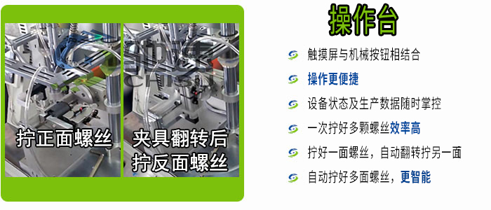 翻转式自动打螺丝机是在固定台面上设计一个可以转动的夹具,通过夹具转动来锁付产品正反两面的螺丝,一台设备可达到双倍固定式锁螺丝机的效率,适合多面螺丝锁付,详细操作可查看网站底部的视频。