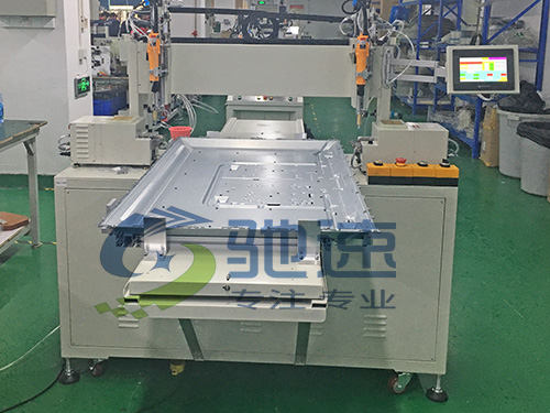 产品螺丝较多,尺寸多样,需要采用坐标式方案来满足设备通用性要求,扁平螺丝需采用吸附式方案,由于吸附式方案需要设备来回去吸取螺丝,然后在逐点锁付,行程长会直接降低设备效率,这里驰速采用双系统坐标式方案,通过左右两套系统共同完成一件产品锁付工作,将设备行程将为原来一般,效率可提升一倍。